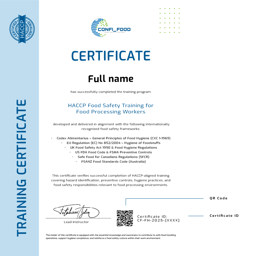 Instantly confirm the authenticity, validity, and origin of any Confi Food training certificate using the Certificate ID or the QR code printed on the document.