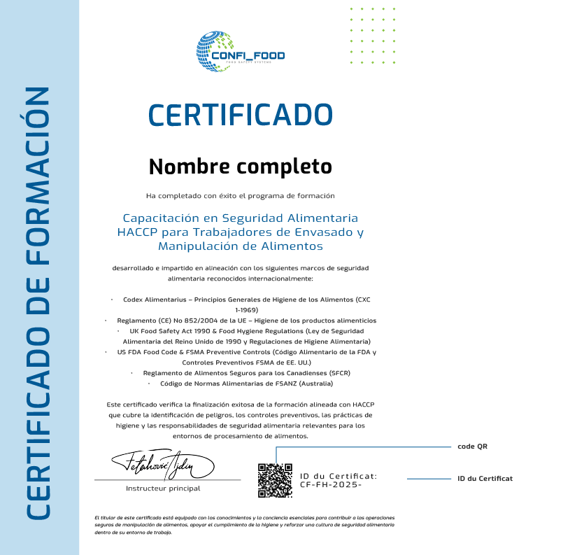 Sí. Cada certificado incluye un código QR que abre al instante el registro oficial de verificación en confifood.com al escanearse con un smartphone.